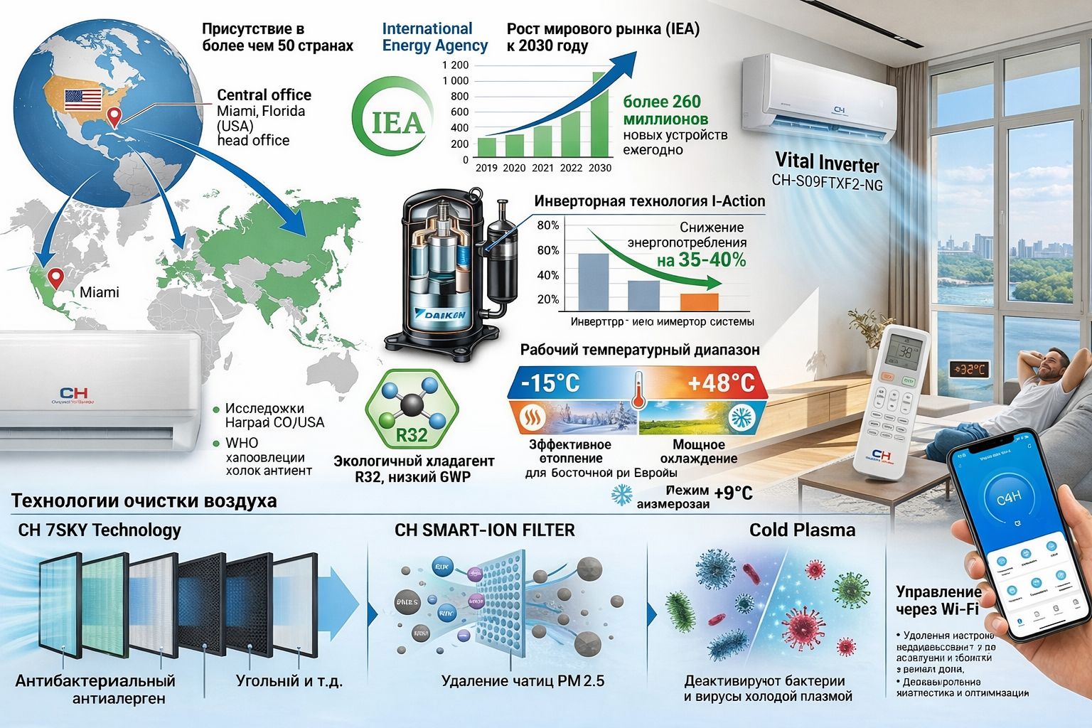 Рынок HVAC-техники за последние десять лет пережил настоящий технологический скачок. Международное энергетическое агентство (IEA) отмечает, что к 2030 году в мире будет установлено более 5,6 млрд климатических устройств, а кондиционирование станет одним из ключевых факторов энергопотребления в городах. На этом фоне кондиционеры cooper&hunter заняли нишу высокоэффективной техники, ориентированной на сочетание энергоэффективности, надежности и адаптации к экстремальным климатическим условиям. Бренд сформировал репутацию производителя оборудования, рассчитанного не только на комфорт, но и на экономию ресурсов: современные инверторные системы способны снижать потребление электроэнергии на 35–45 % по сравнению с традиционными компрессорными решениями.